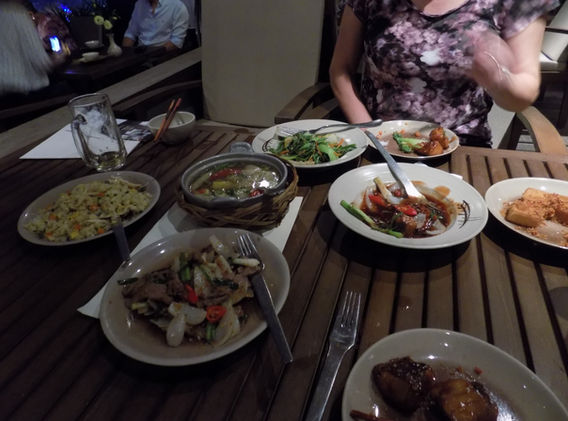 We had a nice lunch buffet, and met a couple from Germany, Ray and Caroline. The boat cruised, and stopped at a beach and pearl farm but we did not disembark. We were tired from the travel and stayed on the boat and relaxed. Shelly took a nap and I sat on the balcony and enjoyed the sights.